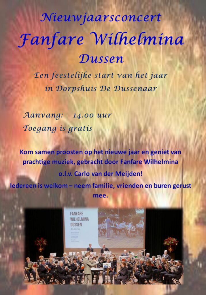 Onder leiding van dirigent Carlo van der Meijden wordt door de fanfare een gevarieerd repertoire ten gehore gebracht. De leden van de fanfare hopen u met hun klanken een mooie start van 2026 mee te geven. Tijdens de pauze en na afloop bestaat de mogelijkheid om met elkaar te proosten op het nieuwe jaar en na te praten over het concert.